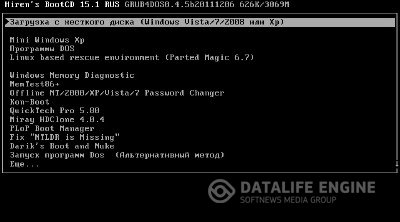 Hiren's BootCD 15.1 Full Rus от Lexapass - незаменимый инструмент, используемый многими компьютерными техниками и системными администраторами. На одном загрузочном CD собраны десятки самых популярных программ и утилит для работы в режиме DOS. Это утилиты для работы с жестким диском, его восстановления и диагностики, утилиты диагностики всех узлов компьютера, файловые менеджеры, утилиты для работы в сети, а также многие другие. Hiren's BootCD избавляет от необходимости держать под рукой десятки и десятки дисков с необходимыми в ежедневной работе программами. В Full-версию дополнительно включены Disk Director Server 10.0.2169 RUS, True Image Echo Server 9.7.8398 RUS и Partition Manager 11 RUS (10.0.17.13146).